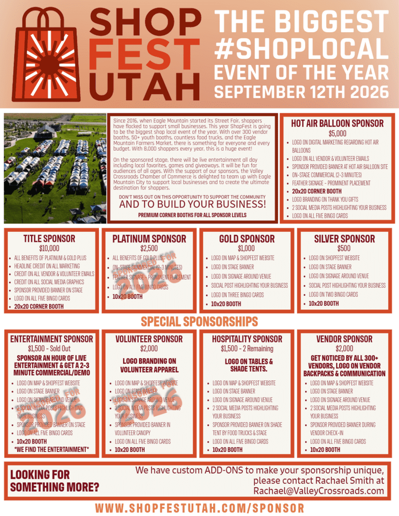 Incredible sponsors and partners have played a pivotal role in the tremendous success of ShopFest Utah. While the primary focus of the event revolves around fostering the growth of small businesses, we understand the importance of boosting your business’s growth and reputation as well. Eagle Mountain City and the Valley Crossroads Chamber of Commerce have diligently created multiple avenues for your business to benefit from sponsoring ShopFest Utah.